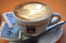 Ein Espresso Lungo (dadurch auch etwas dünner) mit aufgeschäumter Milch. Normalerweise wird Espresso / Milch / Schaum zu gleichen Teilen in die Cappuccino-Tasse gegeben. Auf Wunsch gibt es eine Prise Kakao-Pulver (echter Kakao) darüber.